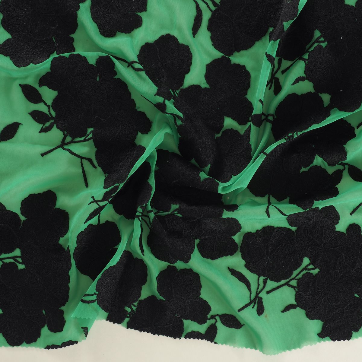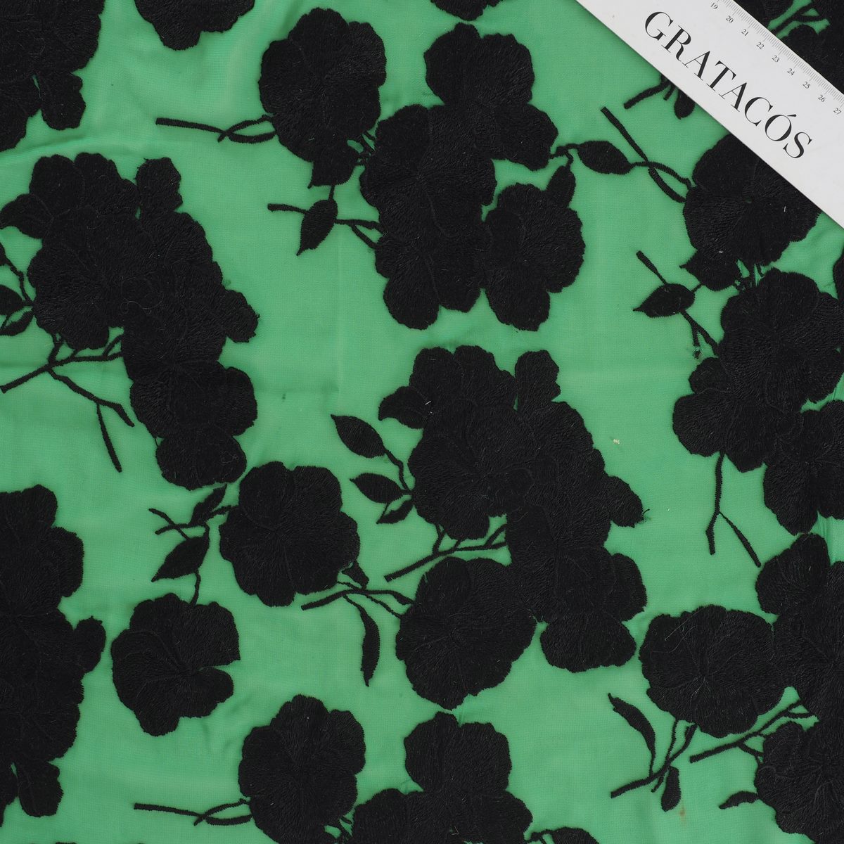 Sofisticado bordado de flor monocolor que contrasta con el fondo de chifón en tono vivo, aportando un aire moderno y elegante al diseño.