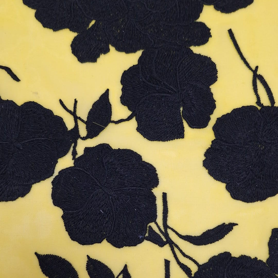 Sofisticado bordado de flor monocolor que contrasta con el fondo de chifón en tono vivo, aportando un aire moderno y elegante al diseño.