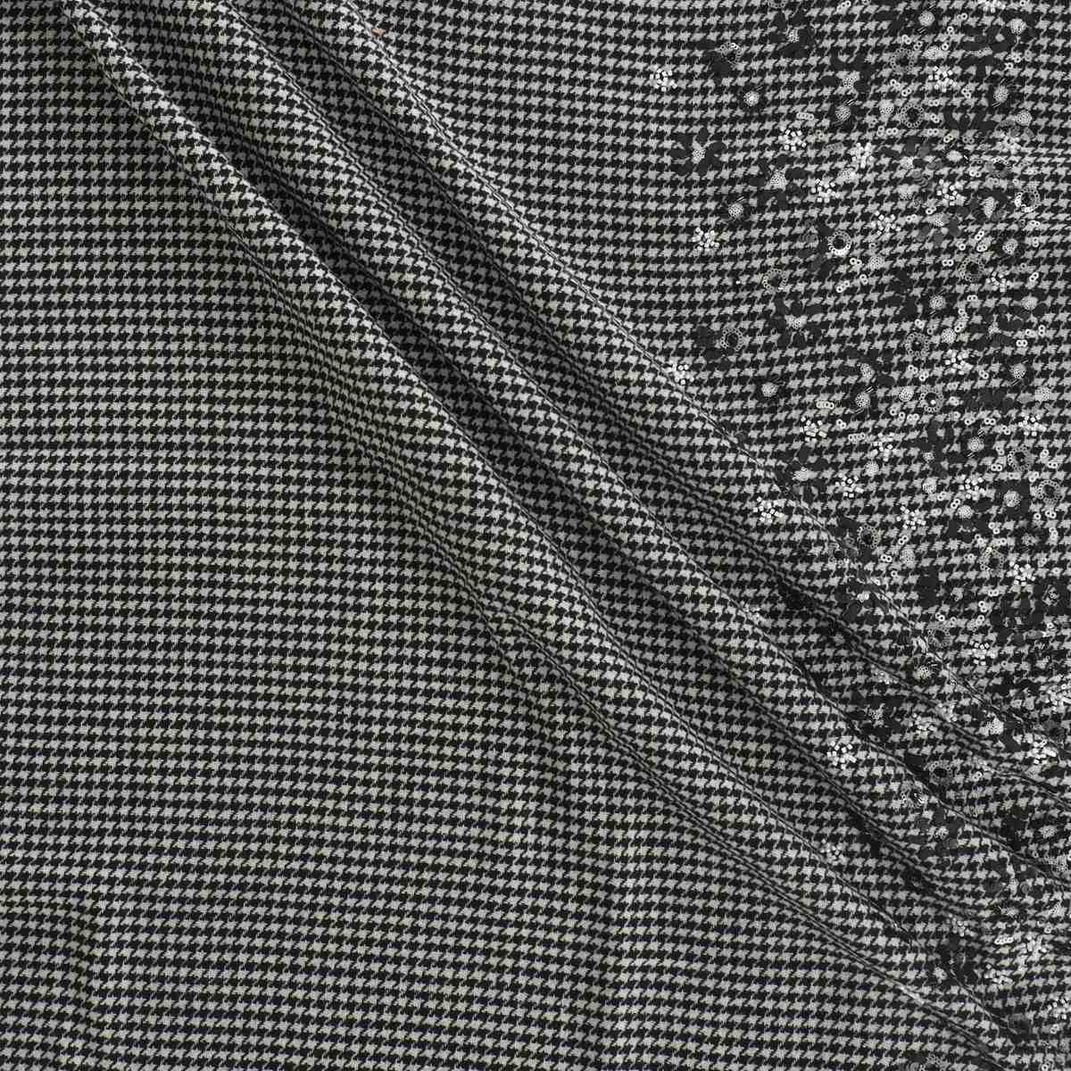 Tejido de pata de gallo en PL y lana con diseño floral de lentejuelas y cuentas de colores, dispuesto en espejo en ambos extremos del tejido; hilo tintado.