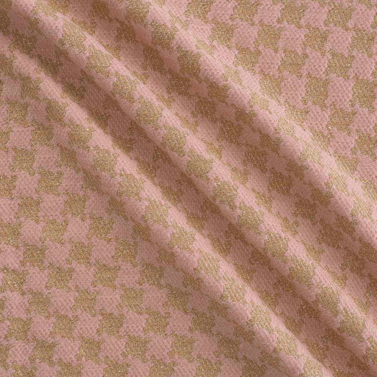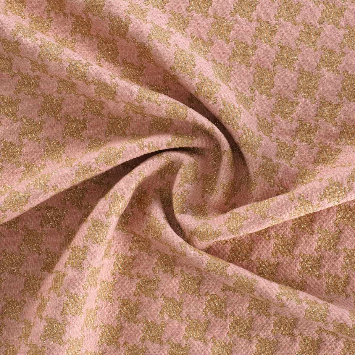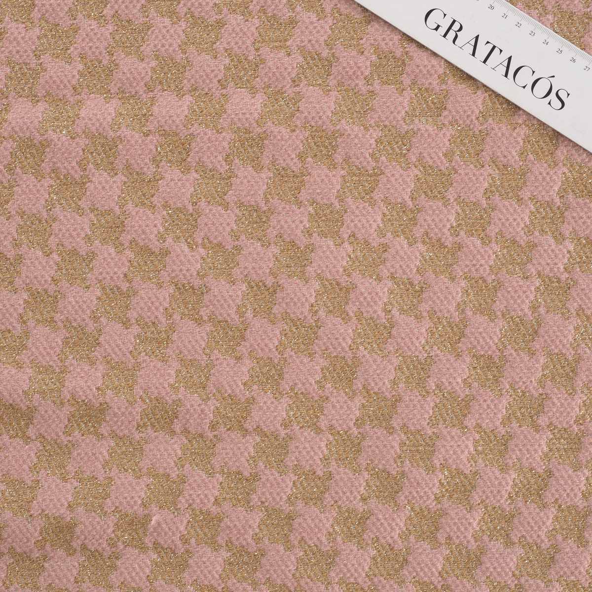 Jacquard con urdimbre de viscosa y trama de lana, acrílico y poliéster. Diseño geométrico pata de gallo con ligero brillo de lamé y colorido bicolor. Mano lanera y acabado sofisticado. Todo hilo tintado.