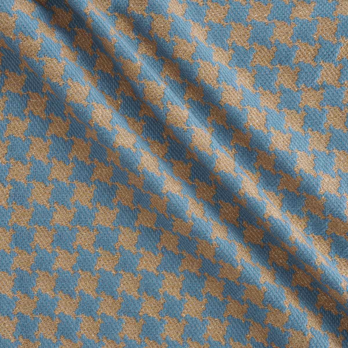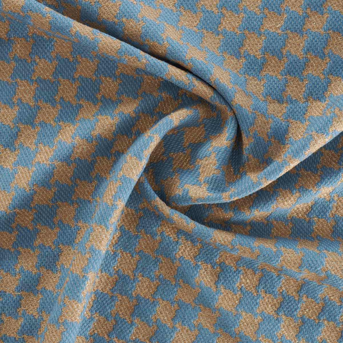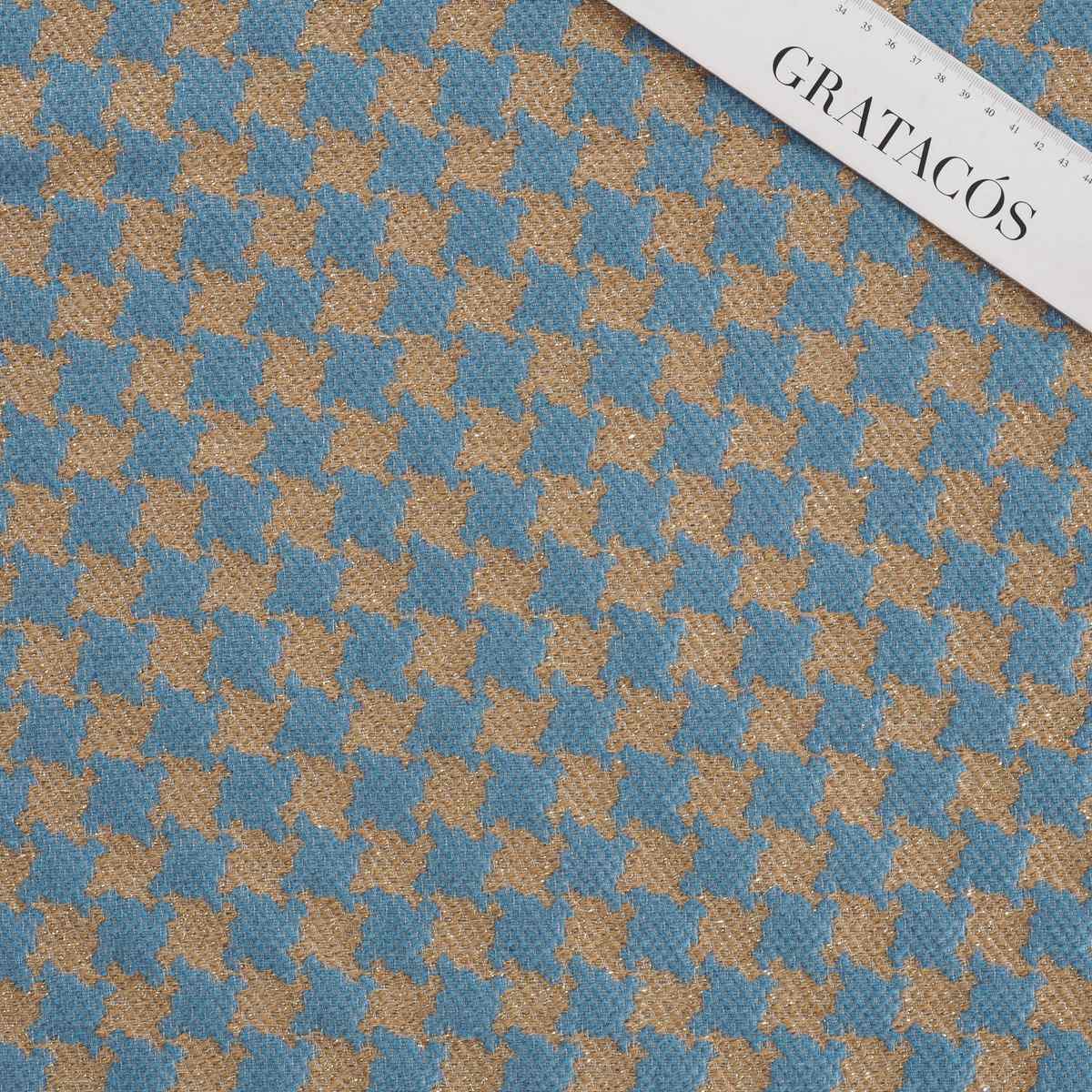 Jacquard con urdimbre de viscosa y trama de lana, acrílico y poliéster. Diseño geométrico pata de gallo con ligero brillo de lamé y colorido bicolor. Mano lanera y acabado sofisticado. Todo hilo tintado.