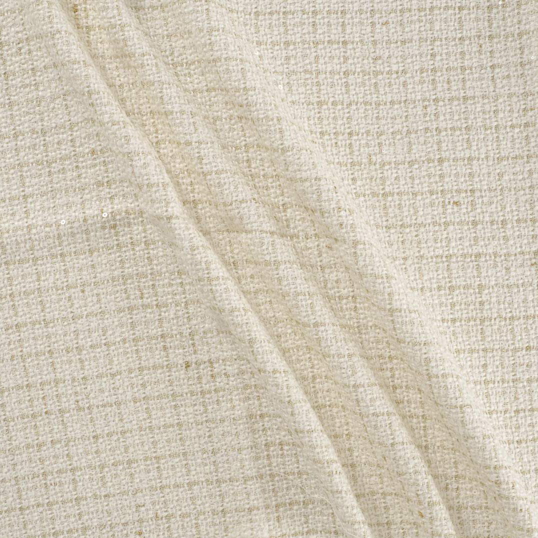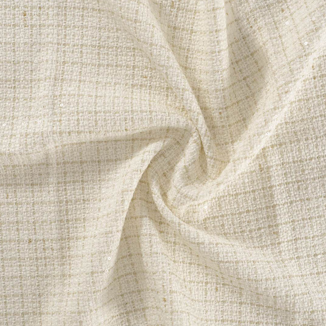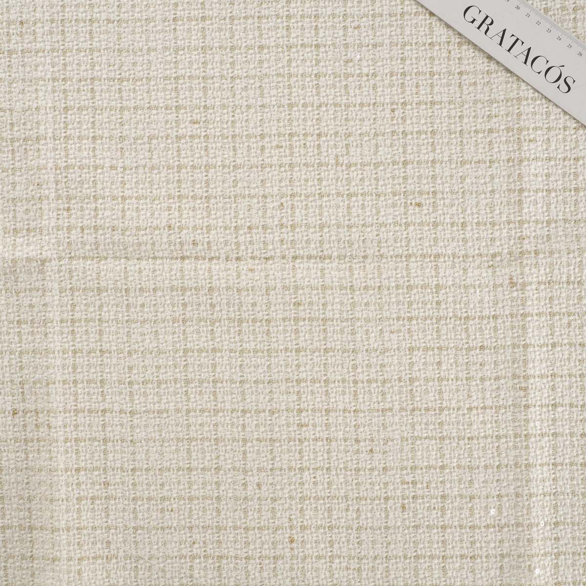 Tweed monocolor con diseño de pequeños cuadros en hilo de lamé y lentejuelas en dos tamaños. Tejido de poliéster y lana. Todo el hilo está tintado.