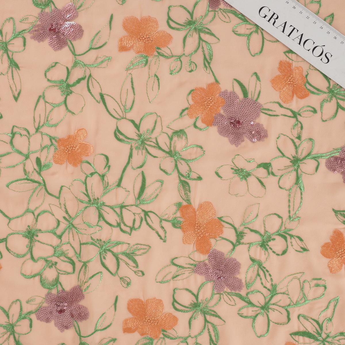 Flores bordadas sobre base de chiffon. Combinamos hilo tintado y lentejuelas para aportar pinceladas de brillo al diseño. Base de poliéster.