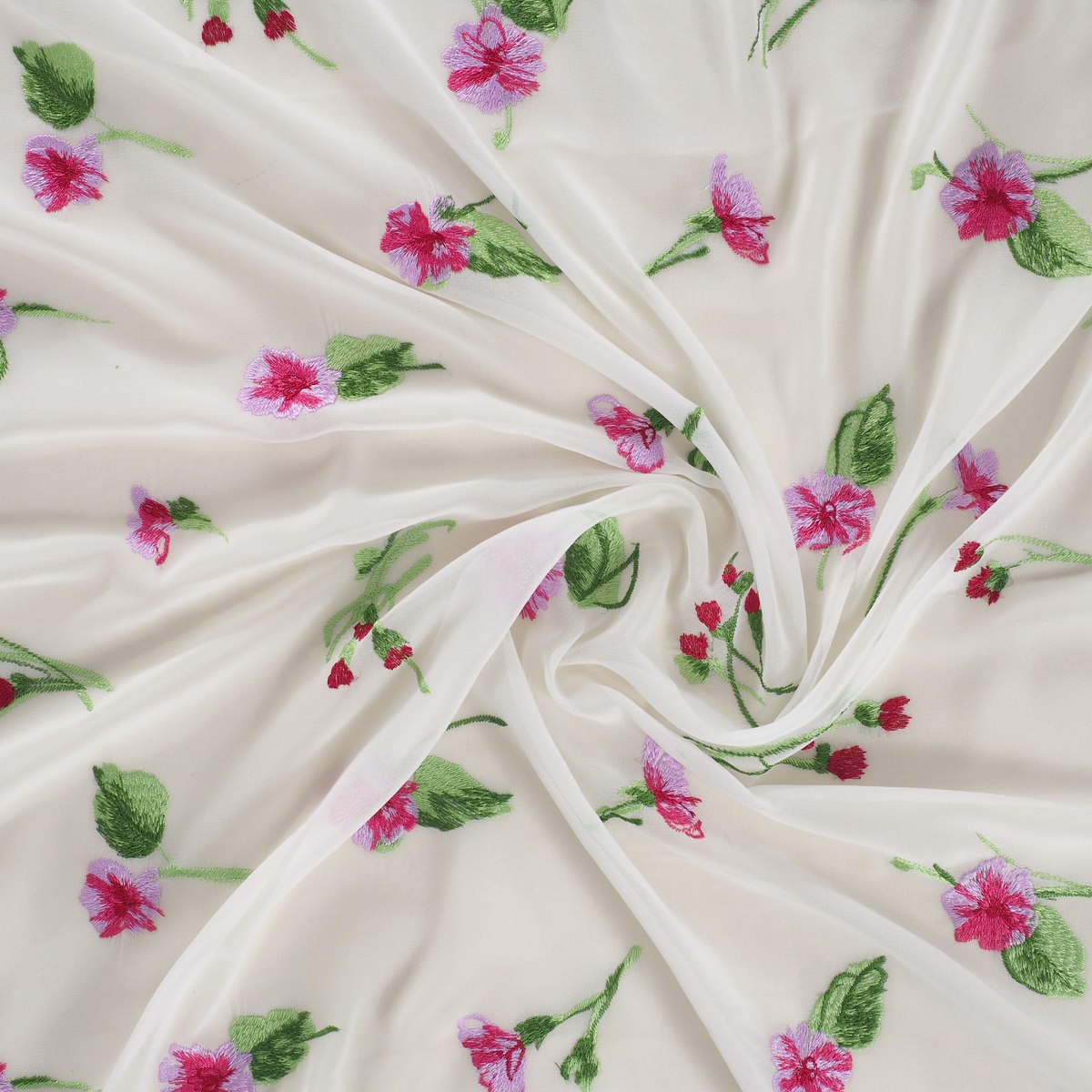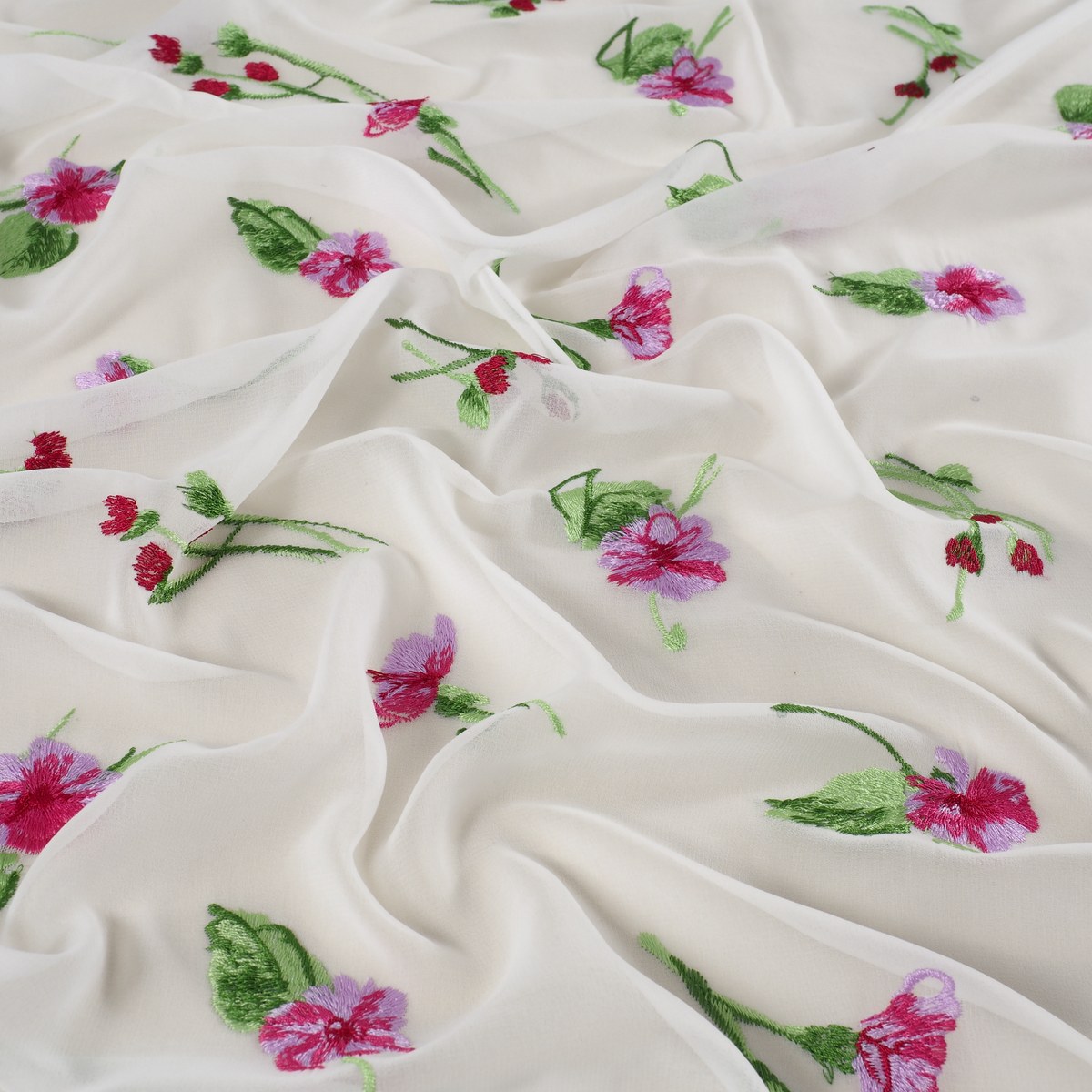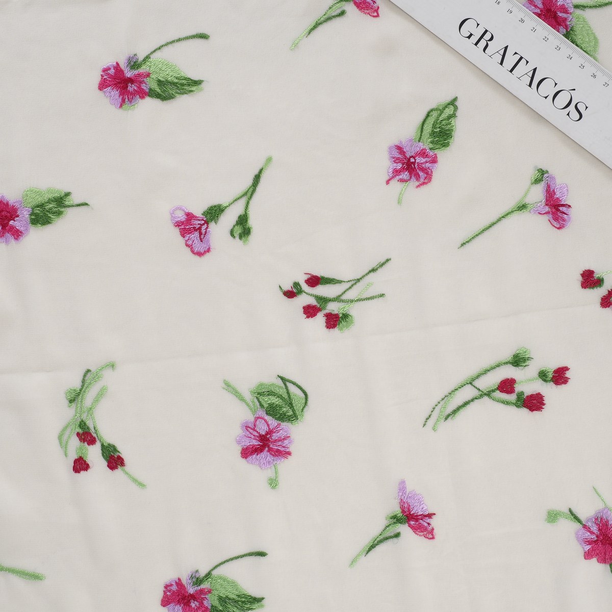 Delicado bordado floral con pequeños bouquets en tonos frescos sobre base de chiffon. Hilo tintado sobre base de poliéster.