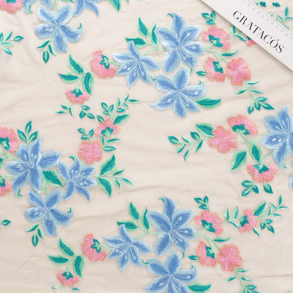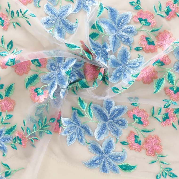 Exotic-inspired floral embroidery on a tulle base. A fresh and vibrant colour palette that brings energy and sophistication.