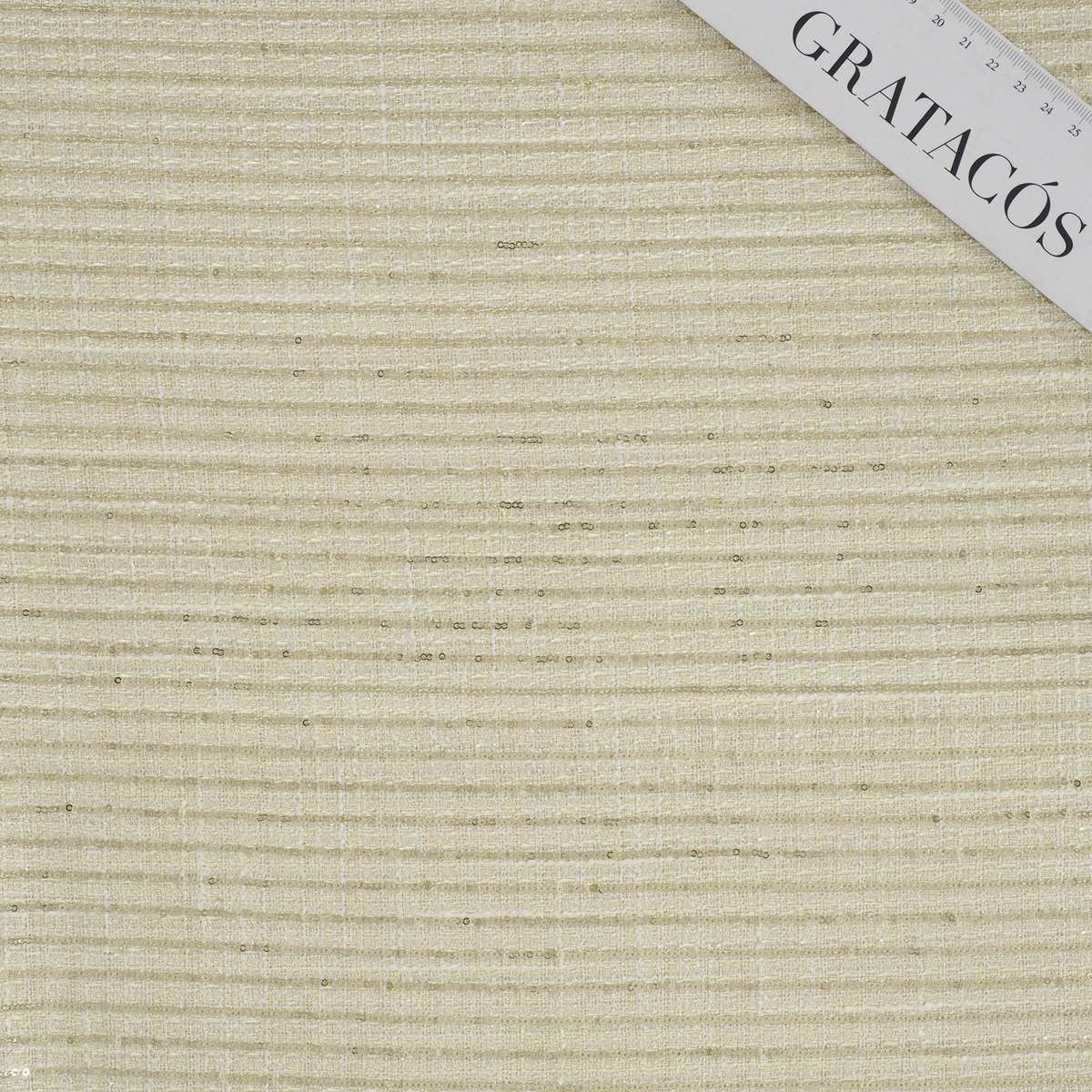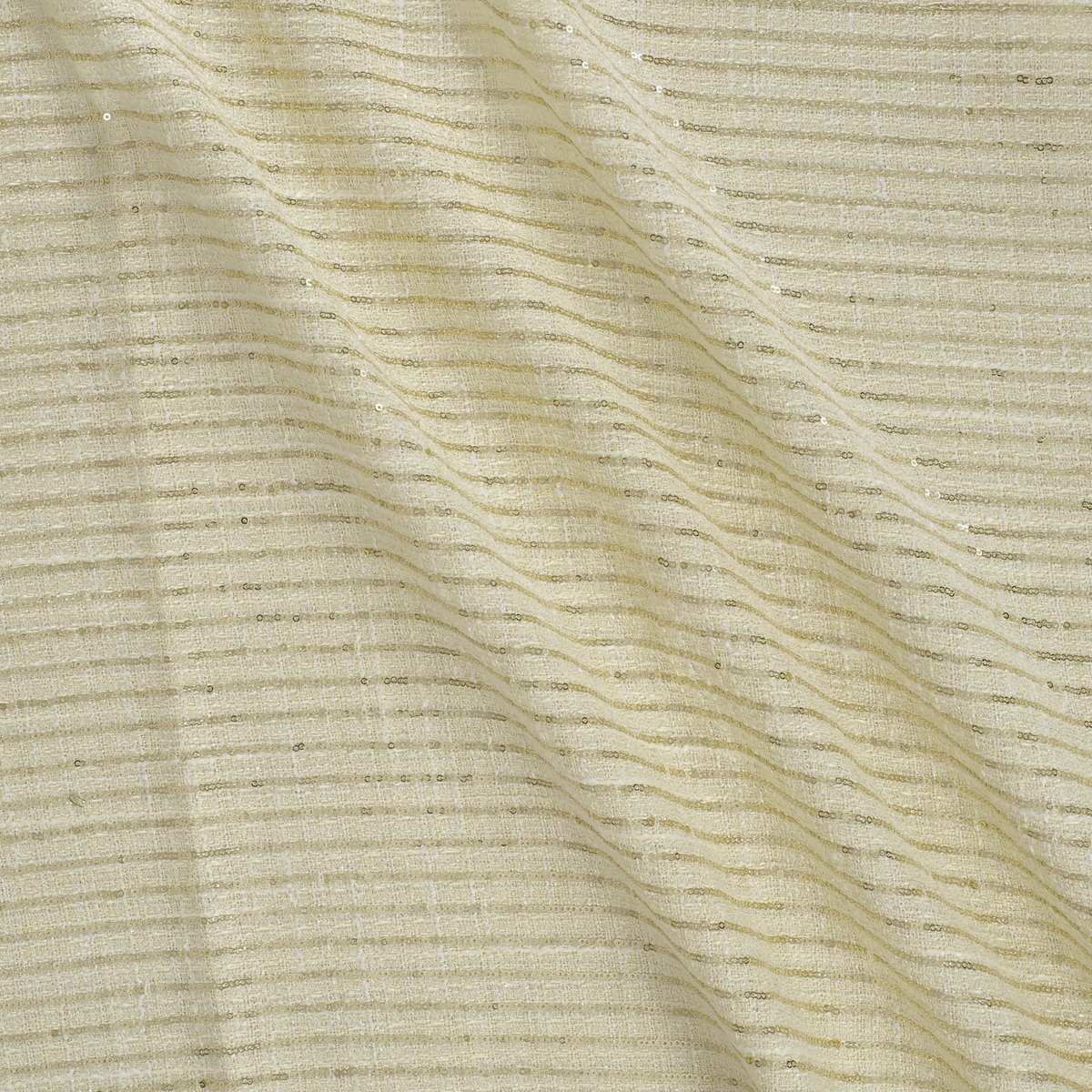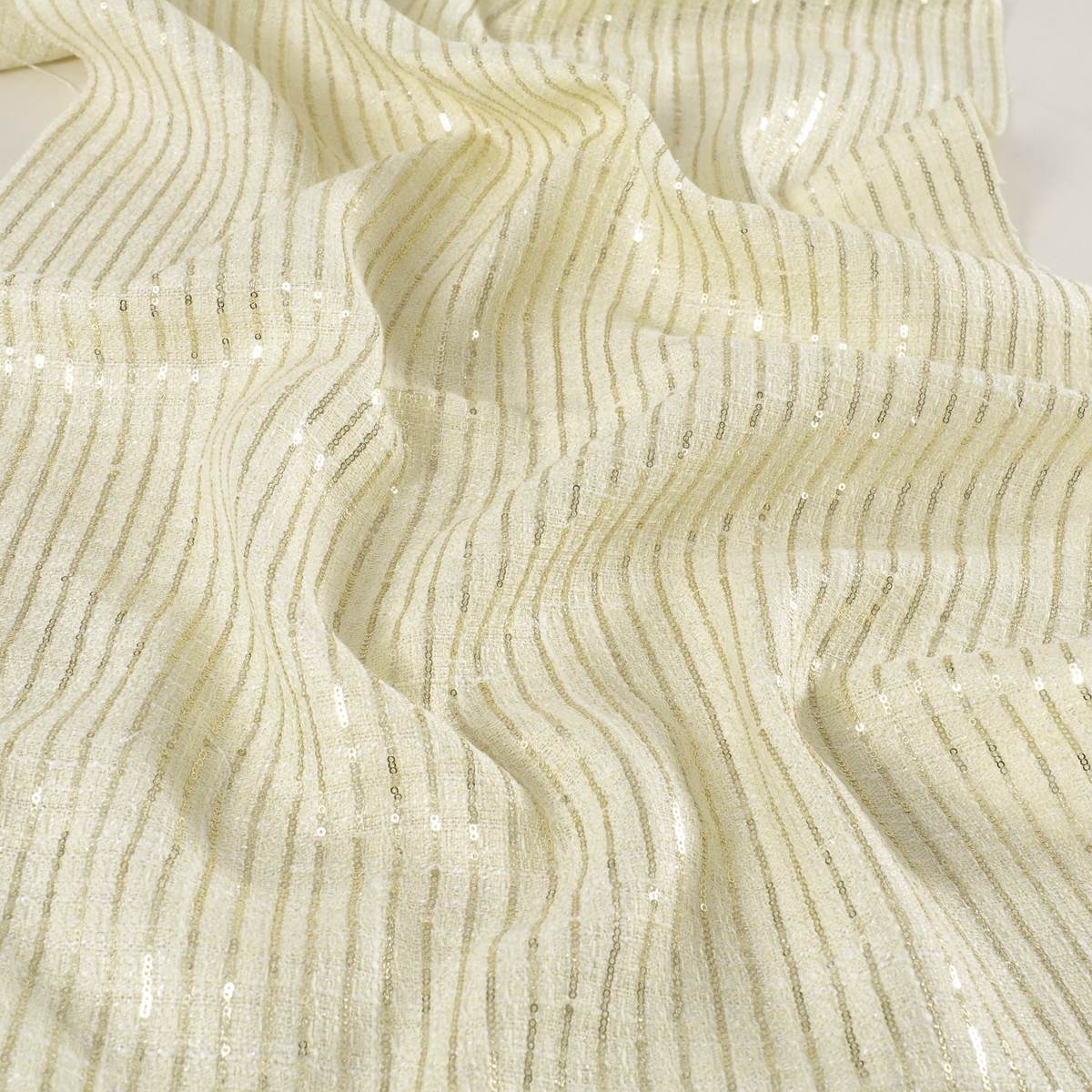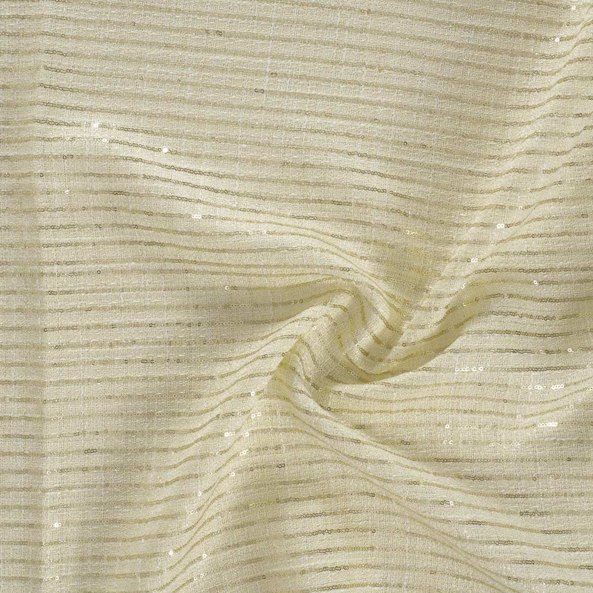 Fresh-coloured tweed with lamé-toned micro-sequins. A refined take on pinstripes with a sophisticated shimmer. Piece-dyed polyester.