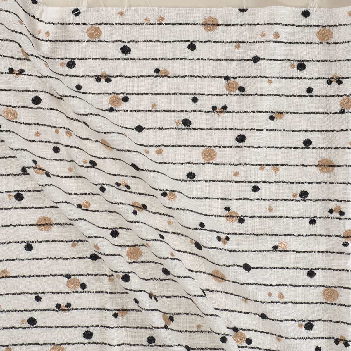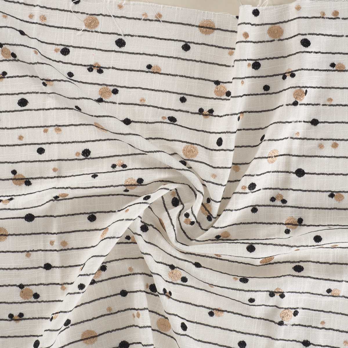 Linen and viscose base embroidered with micro-sequin stripes, overlaid with polka dots in two tones and sizes, playfully arranged across the fabric. Composition: linen, viscose, and polyester embroidery.