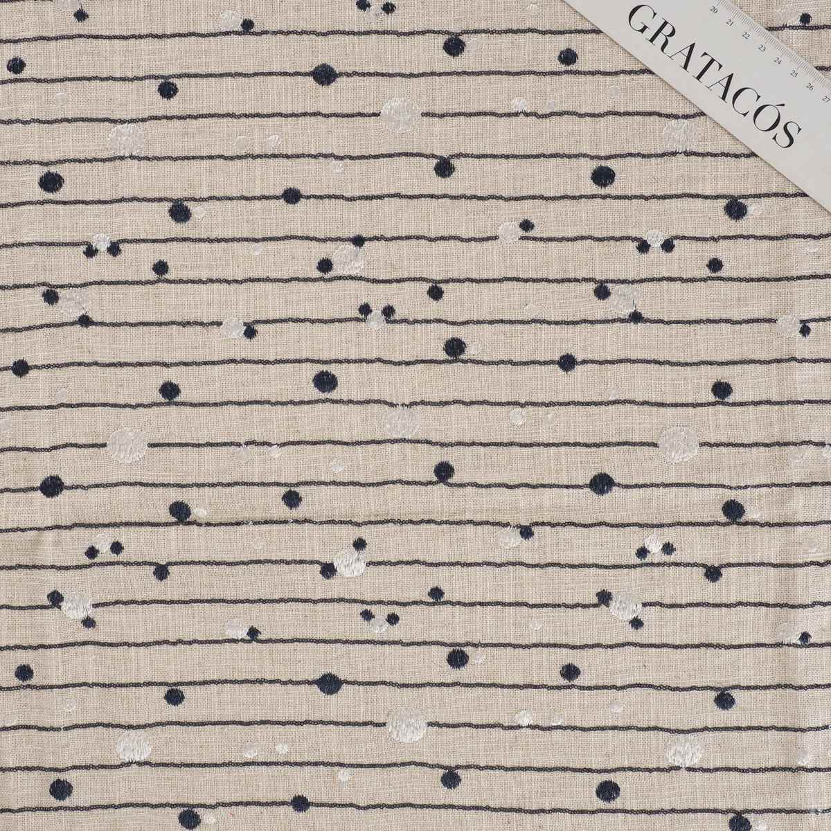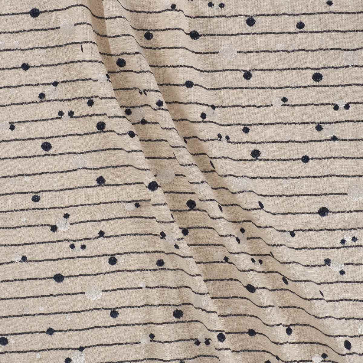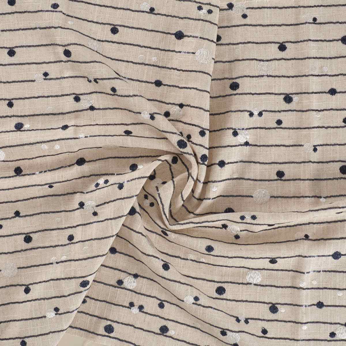 Linen and viscose base embroidered with micro-sequin stripes, overlaid with polka dots in two tones and sizes, playfully arranged across the fabric. Composition: linen, viscose, and polyester embroidery.