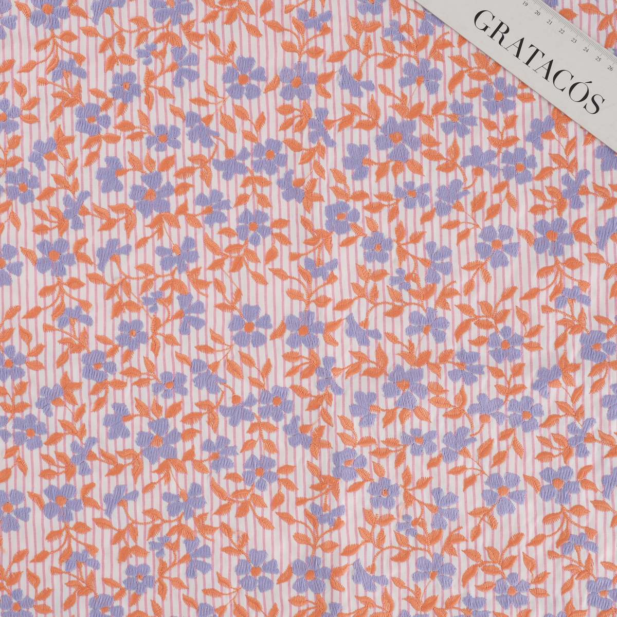 Freshly coloured floral embroidery adds a feminine touch to striped shirting. Cotton and polyester base.