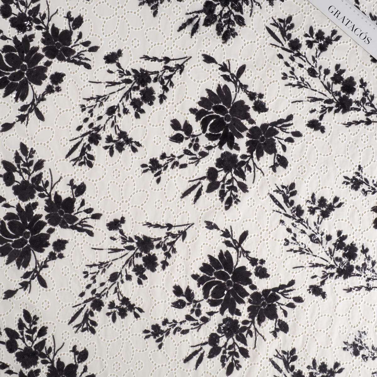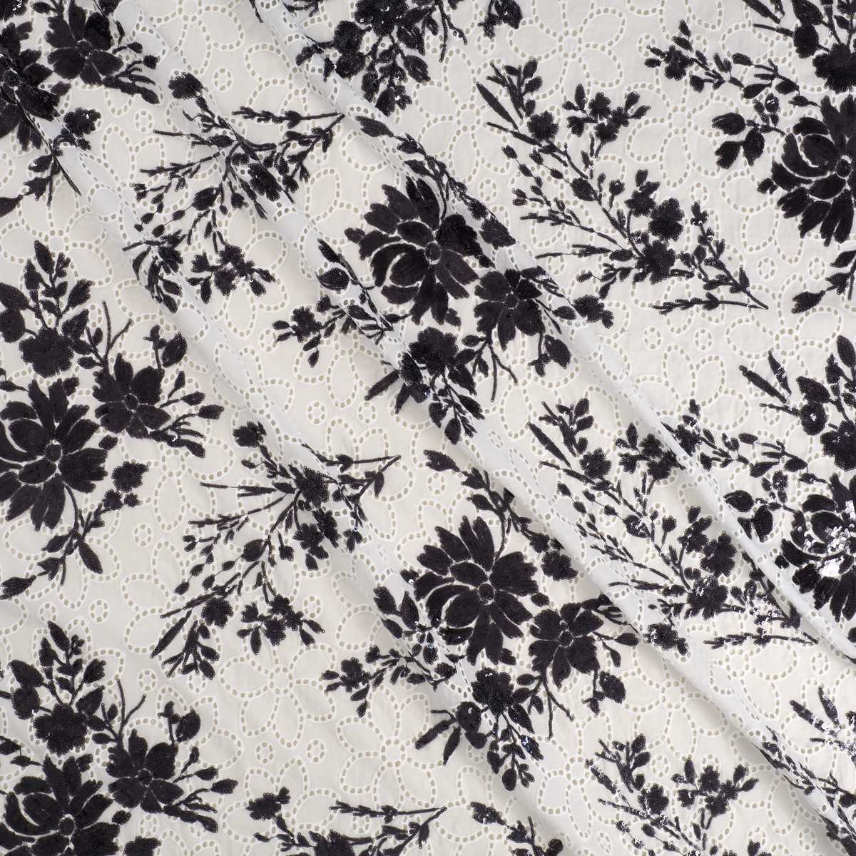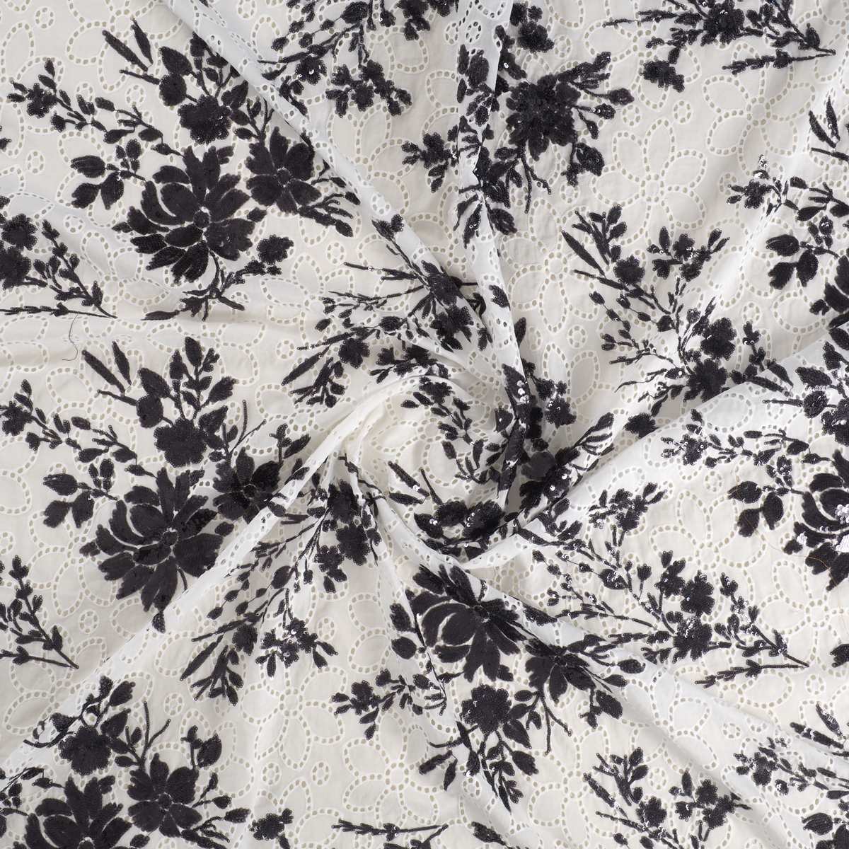 Cotton voile with openwork floral and geometric motifs, overembroidered with delicate floral designs and contrasting paillettes. Piece-dyed.