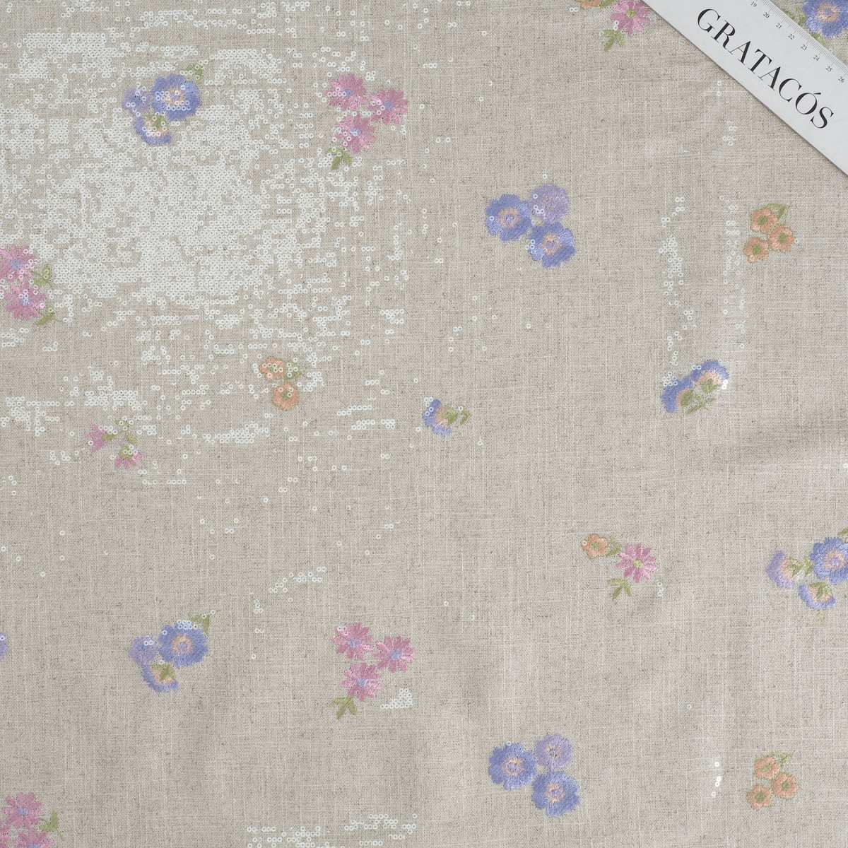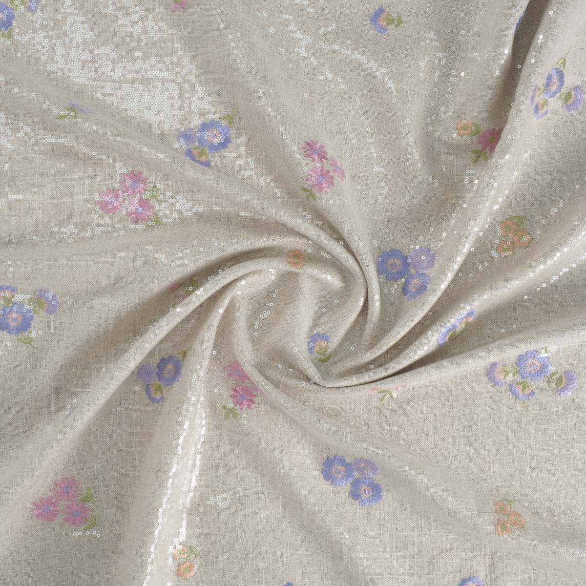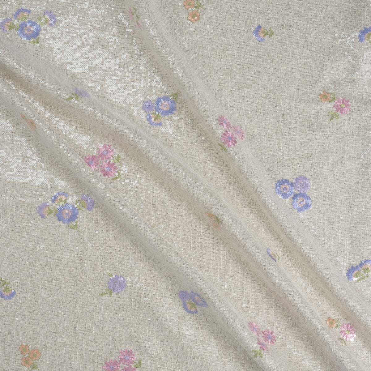 Light and delicate floral embroidery on a linen-viscose base, with transparent micro-sequins adding a subtle shimmer. Embroidered with polyester thread.