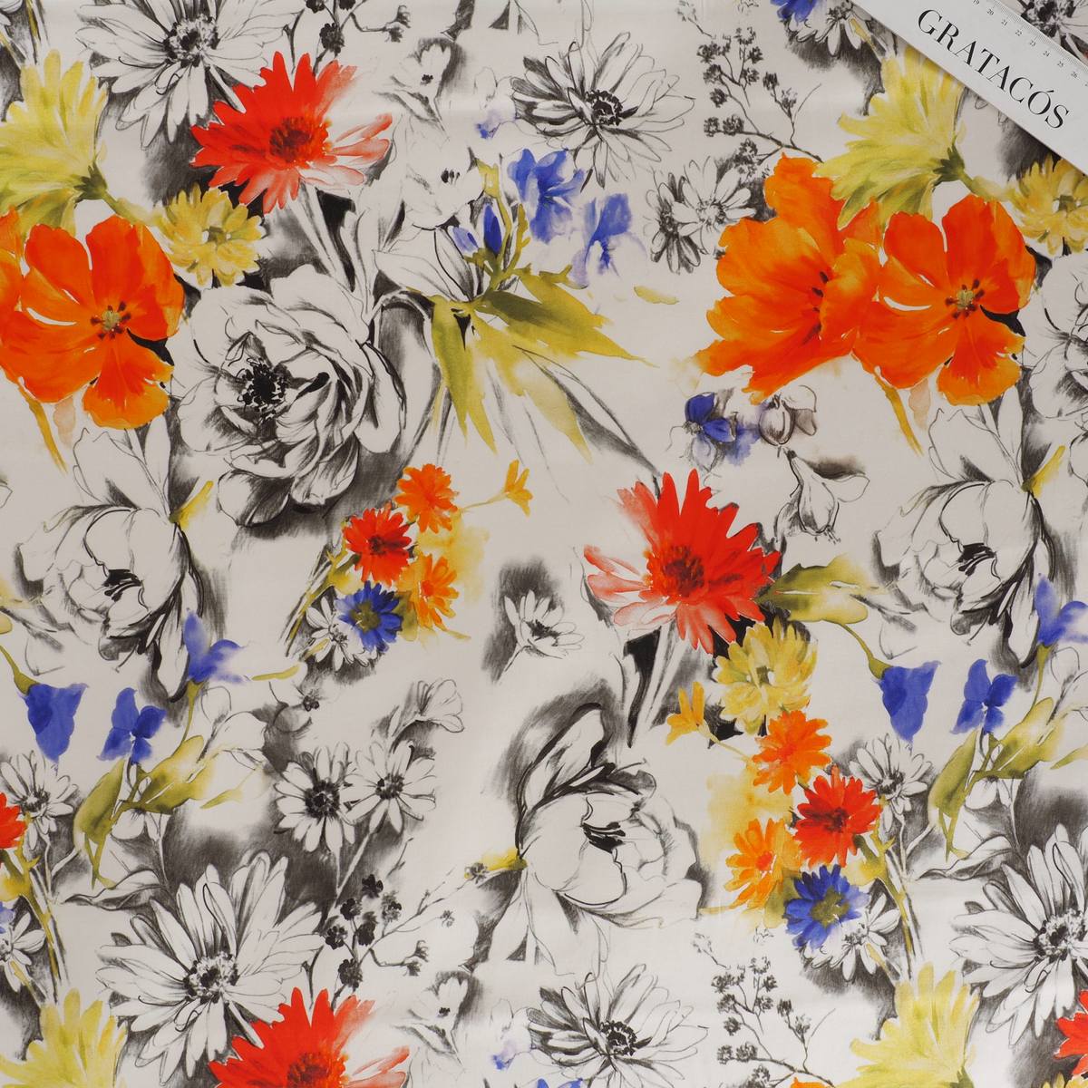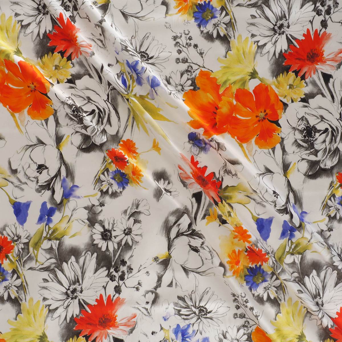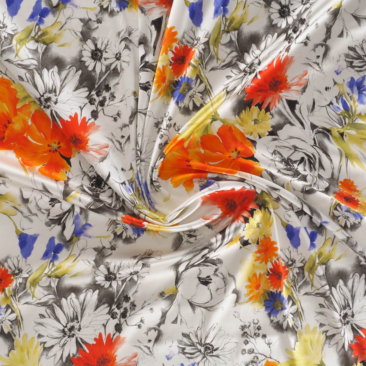 Print on elastic satin. 56 % viscose eco and 4 % elastane. Item E0181 Tramonto