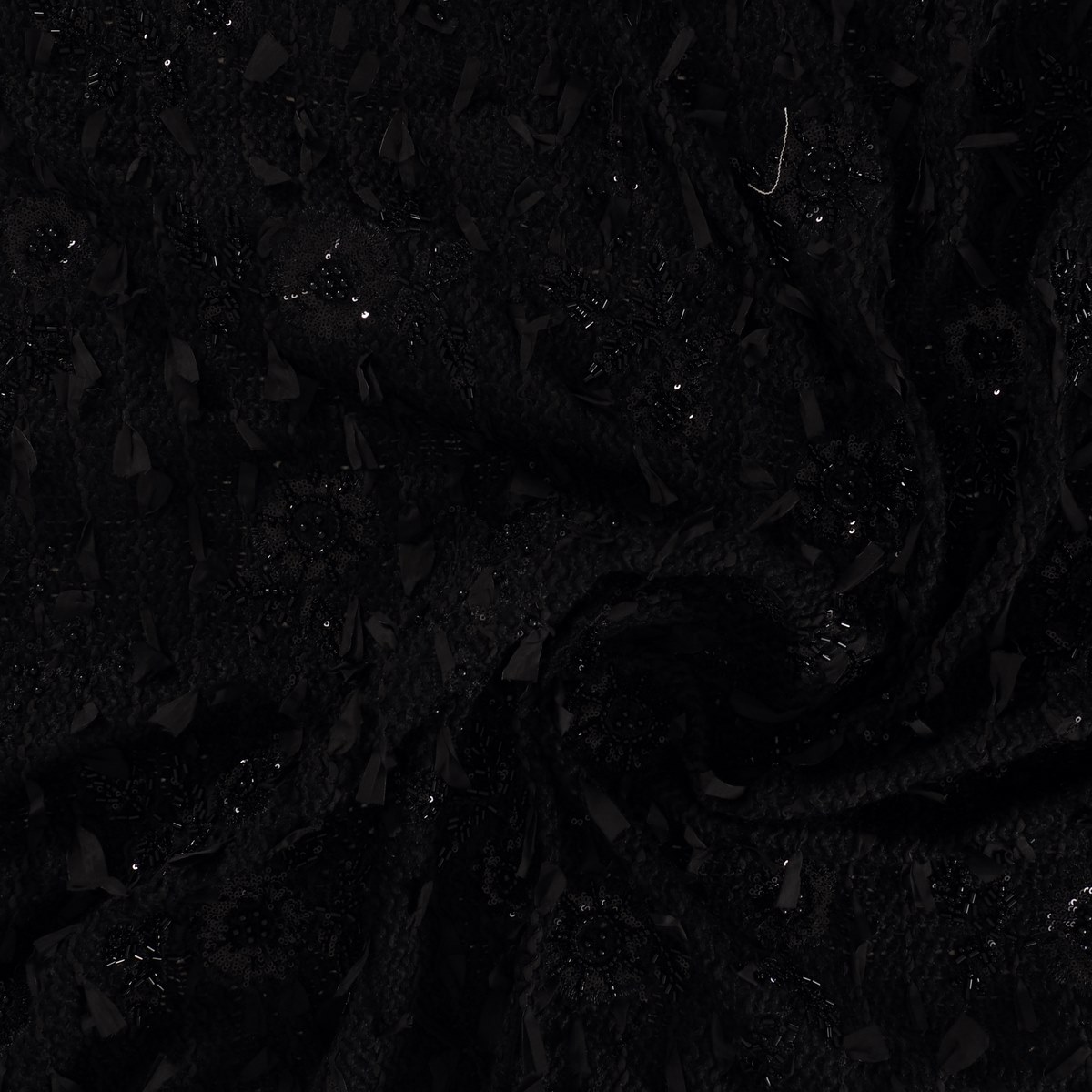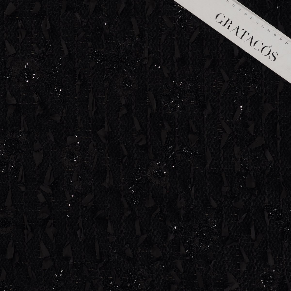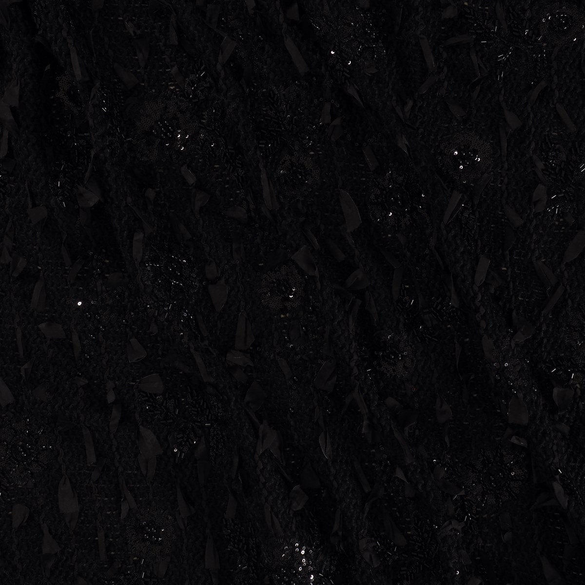 Elegant tweed with embroidered flowers, sequins, and beads in matte and glossy black tones. Raised ribbons add a modern, sophisticated touch. Base of polyester and acrylic.