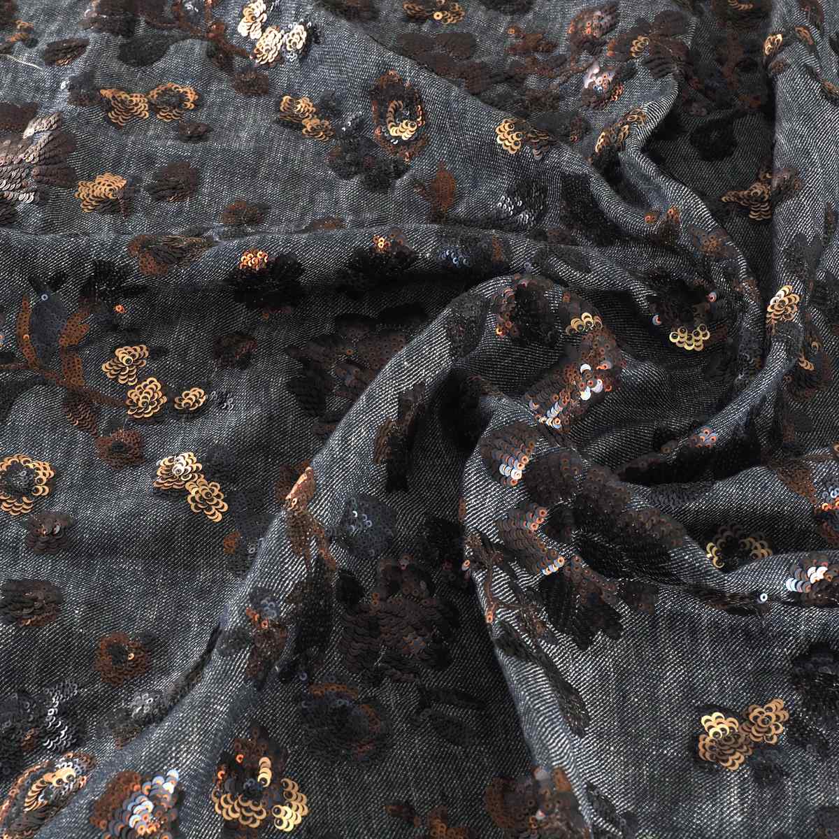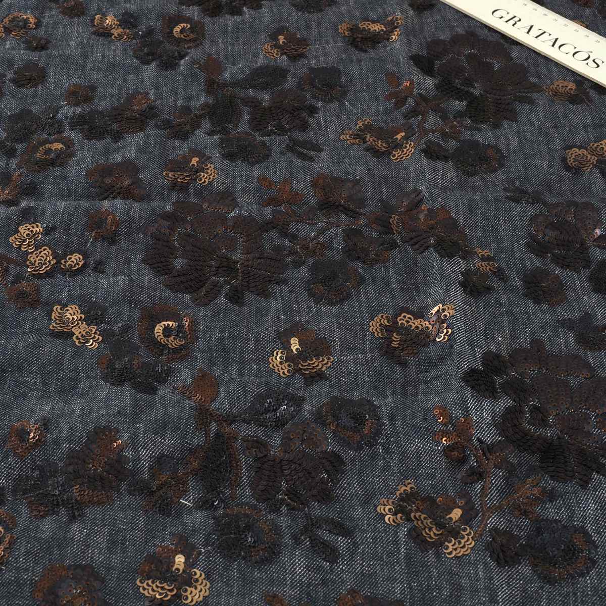 Modern linen base with floral embroidery in matte sequins of two tones and sizes, adding a sophisticated touch. Composition: 60% polyester, 38% linen, 2% polyamide.