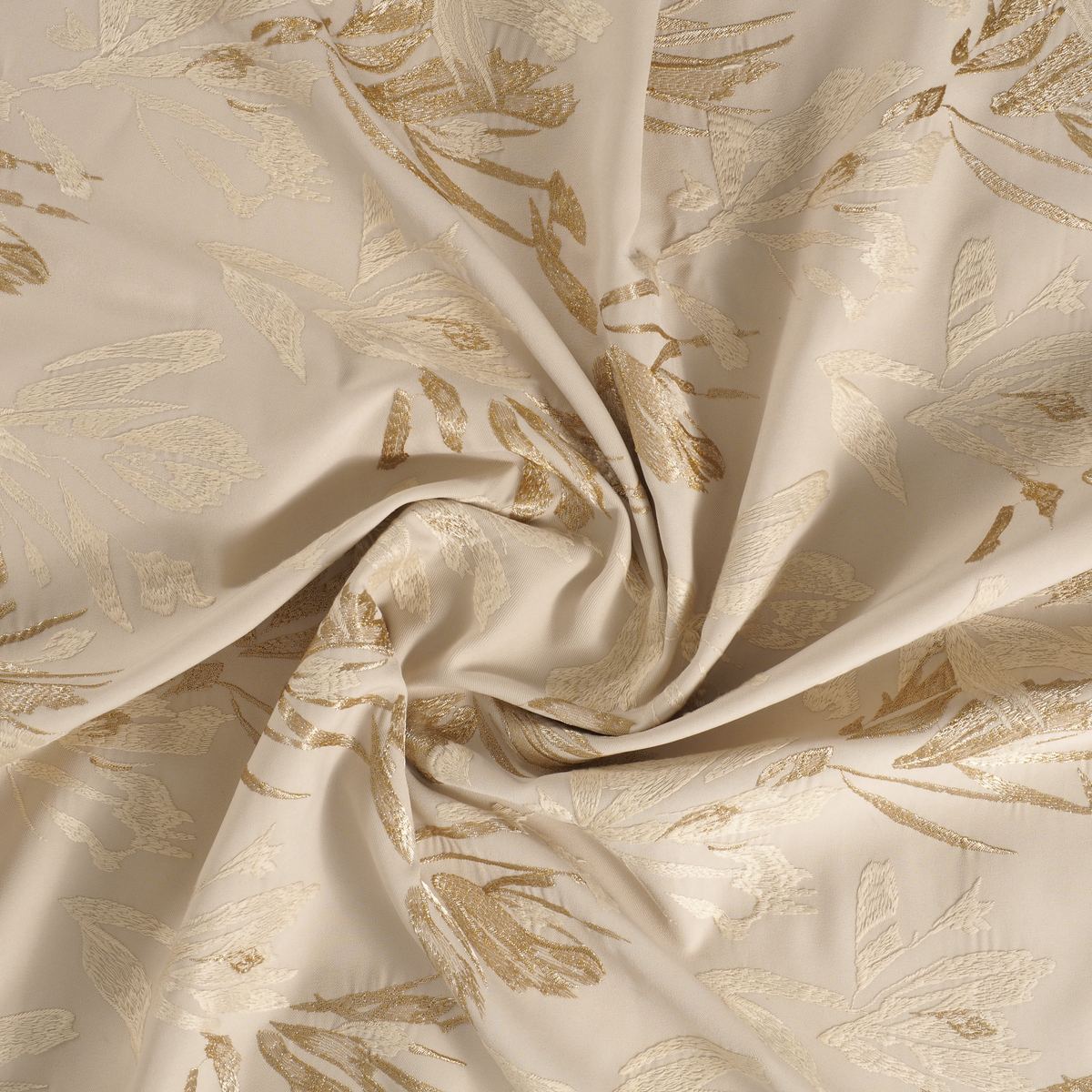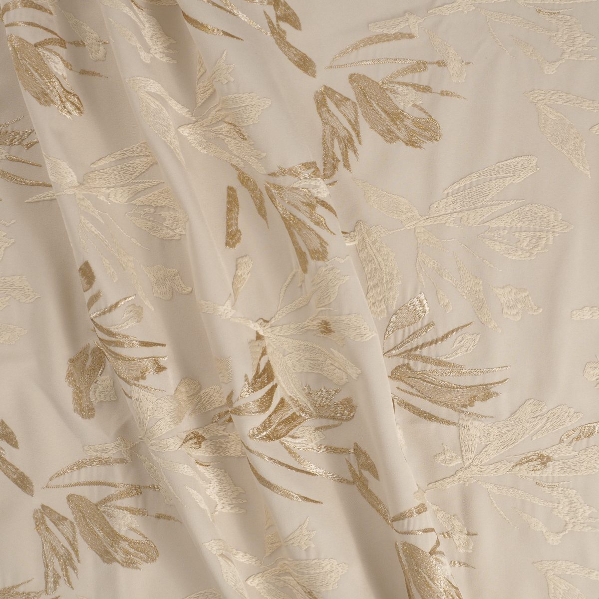 Embroidered twill with gestural leaf design. Metallic and polyester threads combine to give a subtle shine. Piece-dyed base with dyed thread.