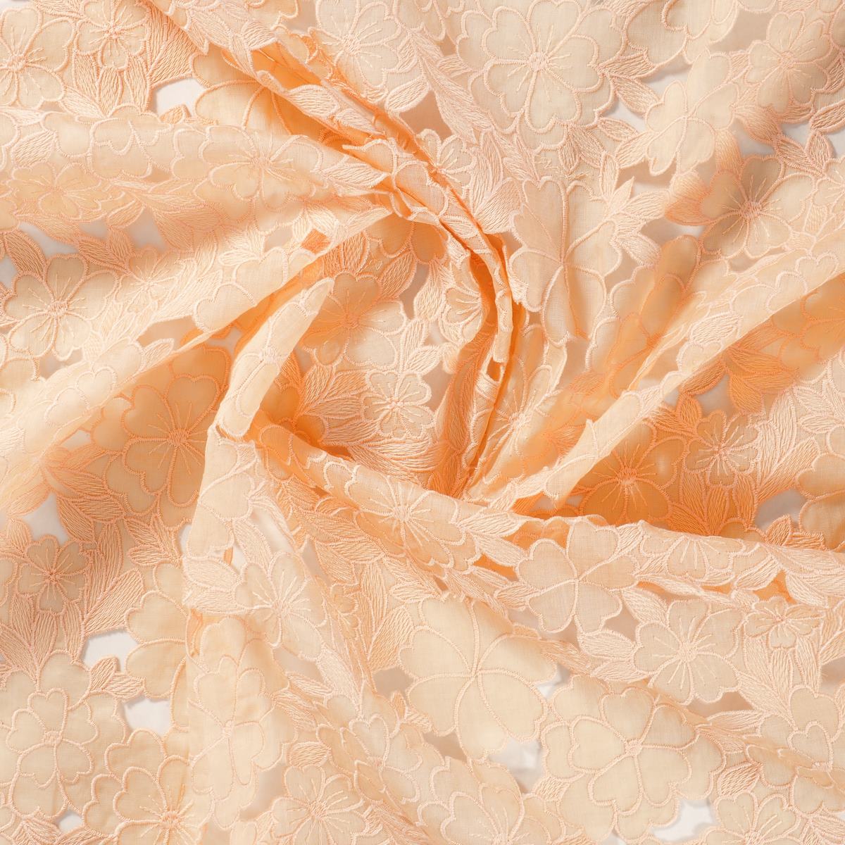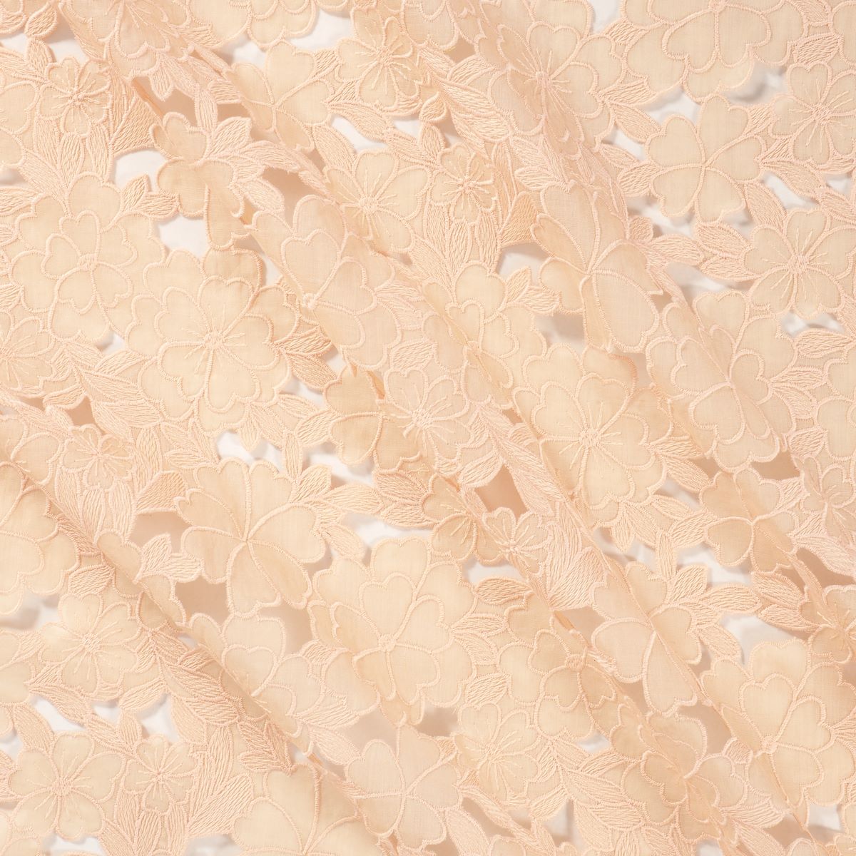 Ramie fabric with a floral design (a delicate fibre that requires extensive work to extract from the plant), laser-cut and then embroidered with tone-on-tone polyester threads.
