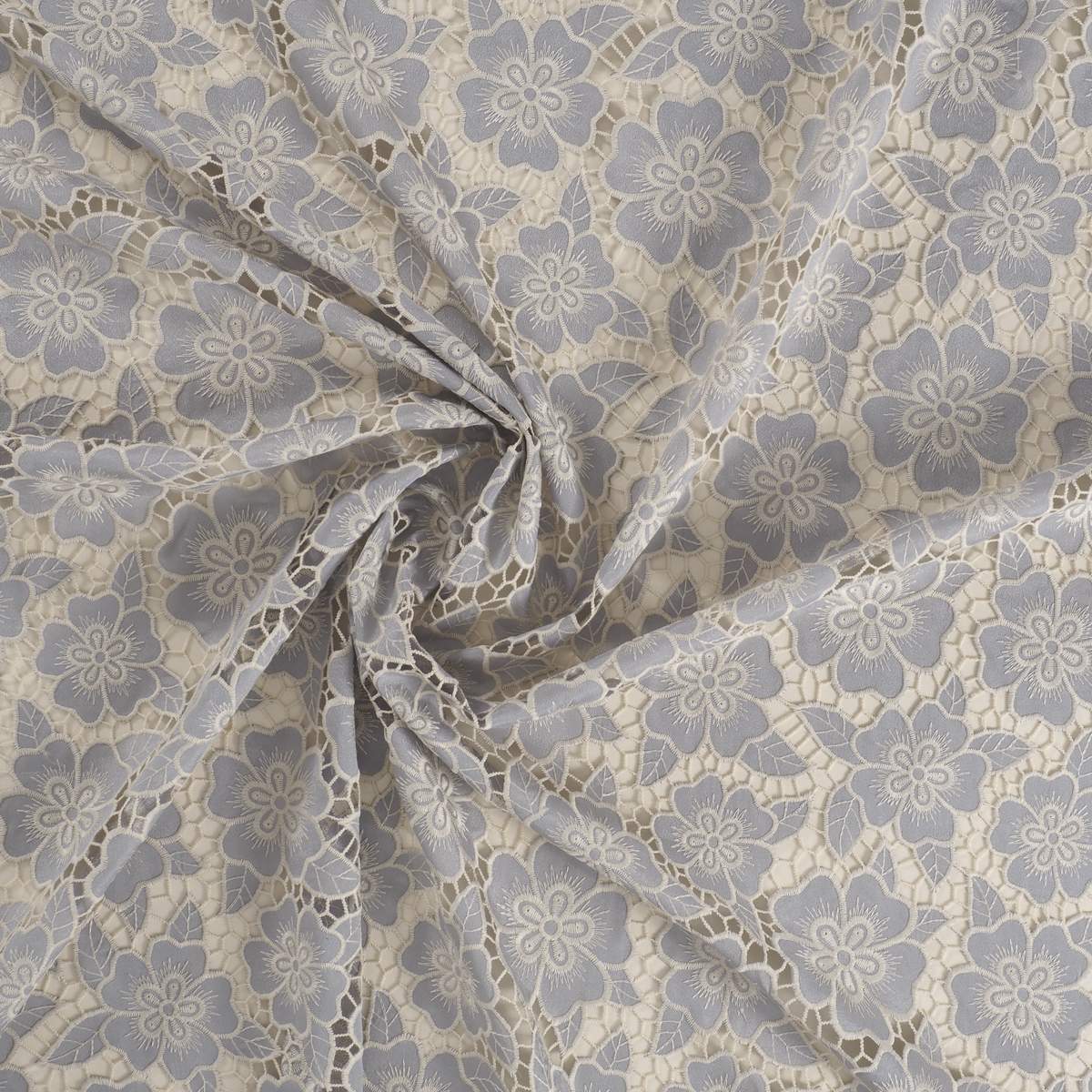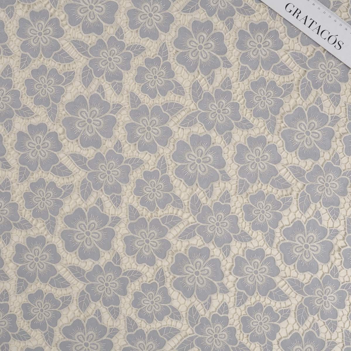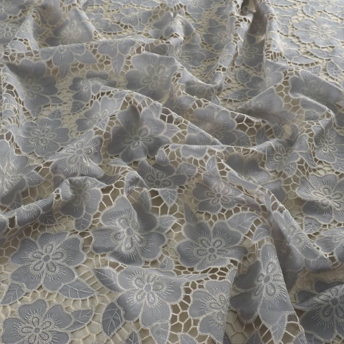 Tone-on-tone floral embroidery on an open mesh background.