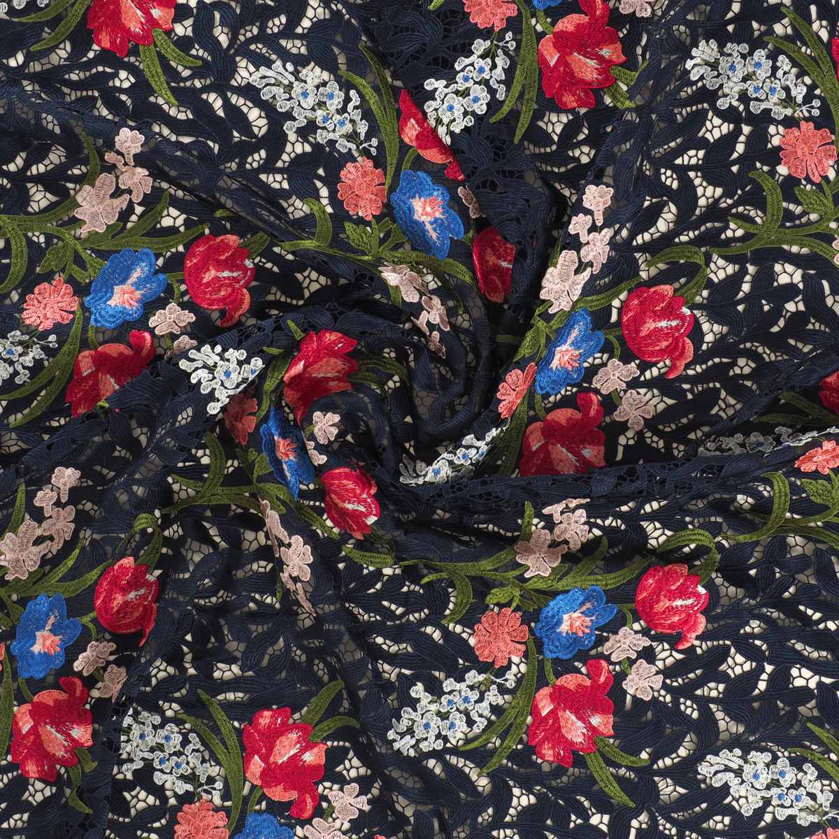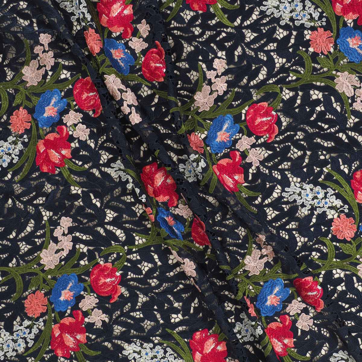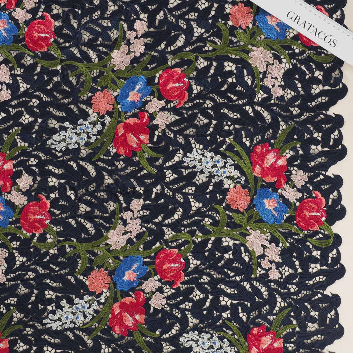 Beautiful guipure with leaf design, overembroidered with multicoloured flowers that bring freshness and richness to the background. Dyed polyester thread.