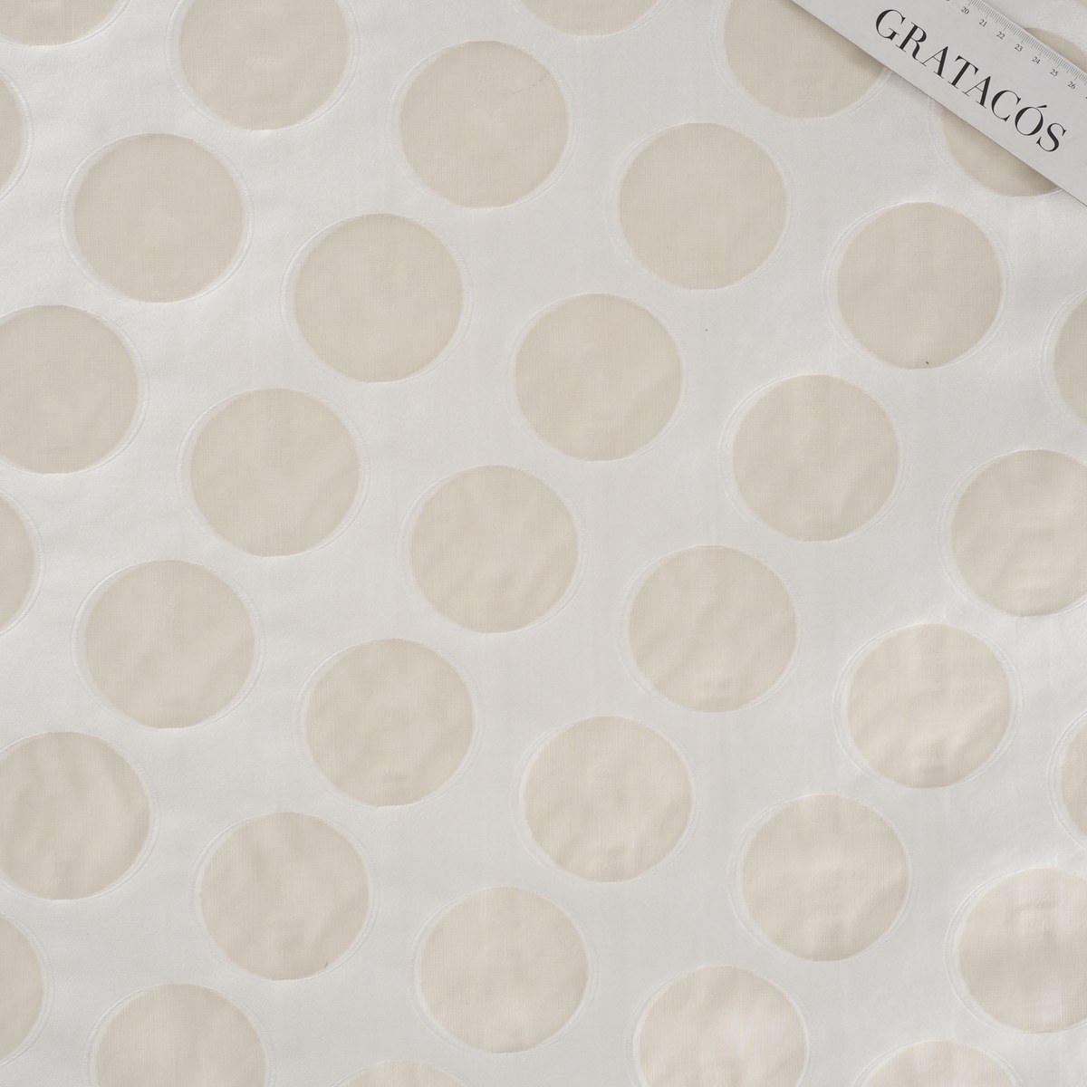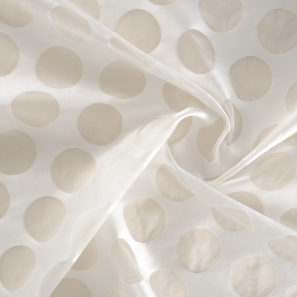 JACQUARD WITH FIL COUPÉ TECHNIQUE WITH 79% PL AND 21% SILK. NEW VERSION OF THE CLASSIC POLKA DOTS IN AN ITEM WITH LARGE POLKA DOTS WITH TRANSPARENCY INSIDE. SOFT AND SUSTAINED HAND. ALL THREAD DYED.