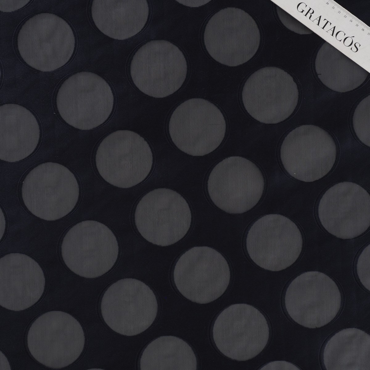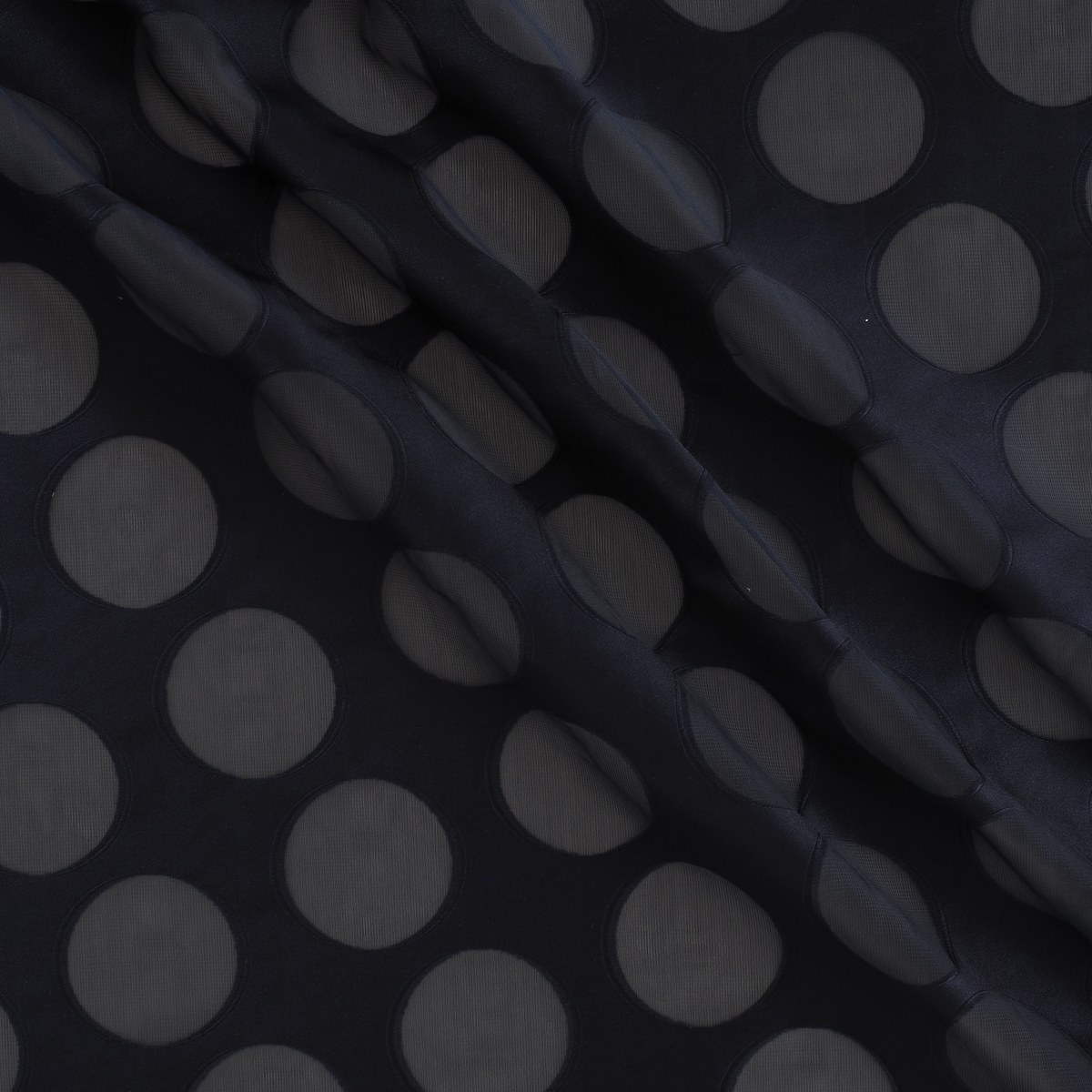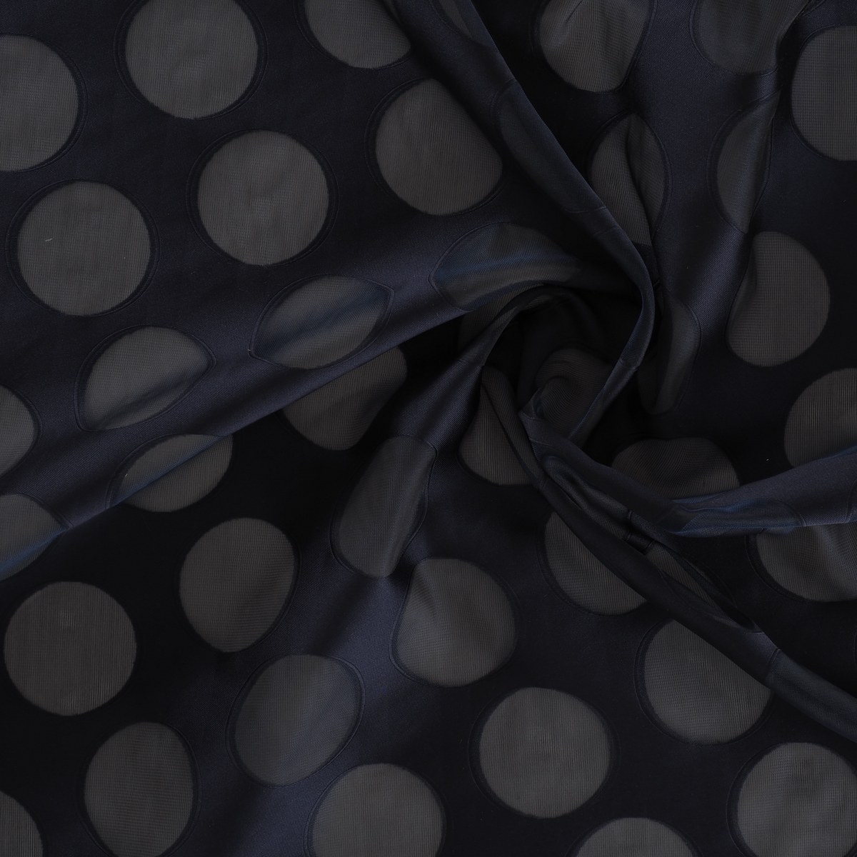 JACQUARD WITH FIL COUPÉ TECHNIQUE WITH 79% PL AND 21% SILK. NEW VERSION OF THE CLASSIC POLKA DOTS IN AN ITEM WITH LARGE POLKA DOTS WITH TRANSPARENCY INSIDE. SOFT AND SUSTAINED HAND. ALL THREAD DYED.