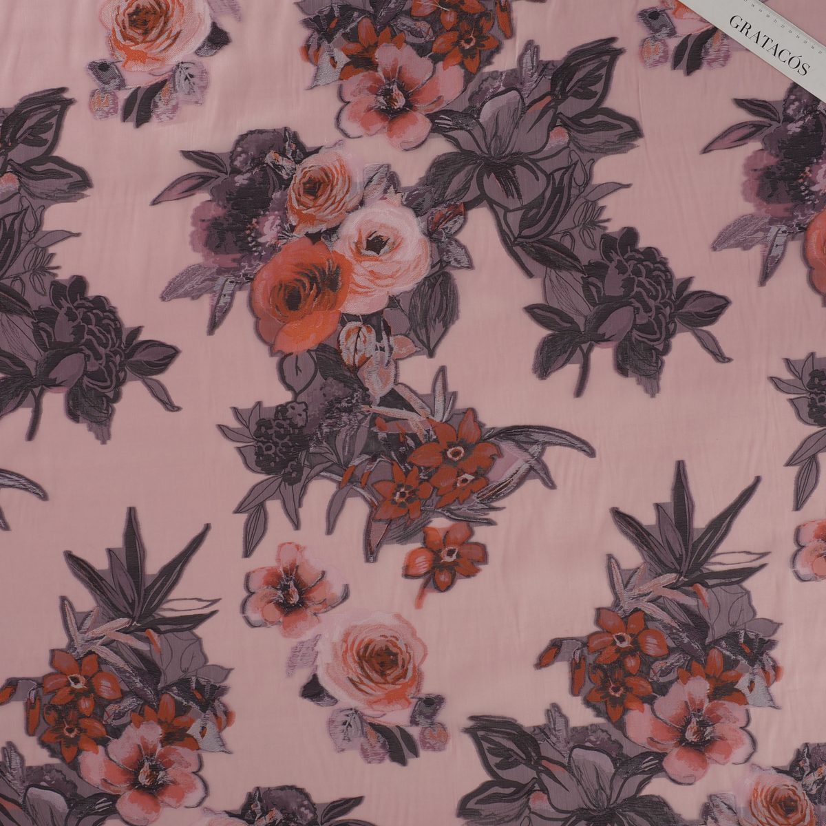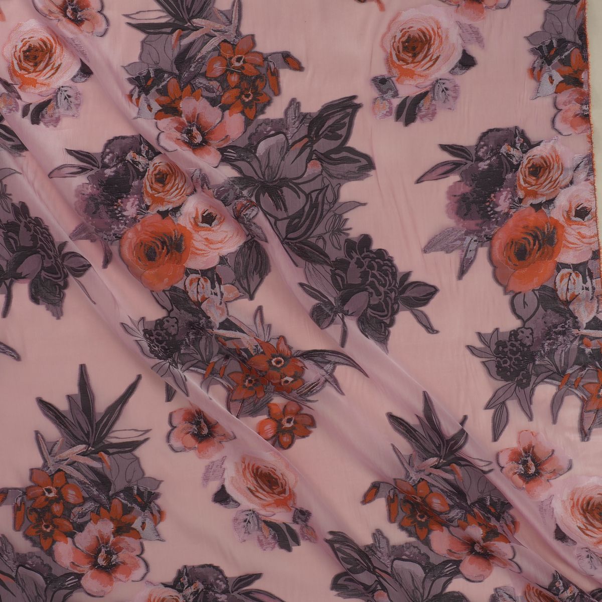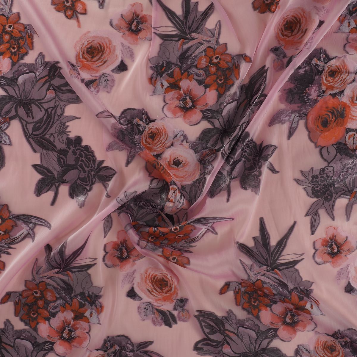 JACQUARD WITH SILK, ACETATE AND LAMÉ. THE FABRIC HAS BEAUTIFUL FLORAL DESIGN USED WITH DIFFERENT TECHNIQUES. THE FIL COUPÉ TECHNIQUE ALLOWS FOR A TRANSPARENT BACKGROUND. THE LAMÉ GIVES A SHINE ASPECT. ALL DYED THREAD.
