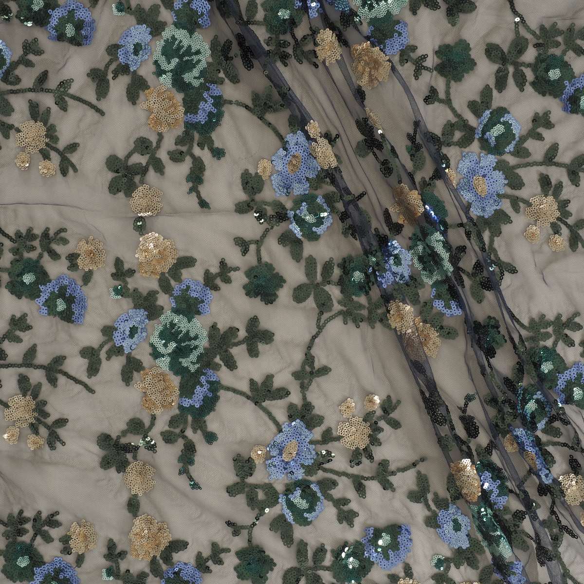 Floral embroidery with a mix of matte and transparent sequins on a 100% polyamide tulle base; yarn-dyed.
