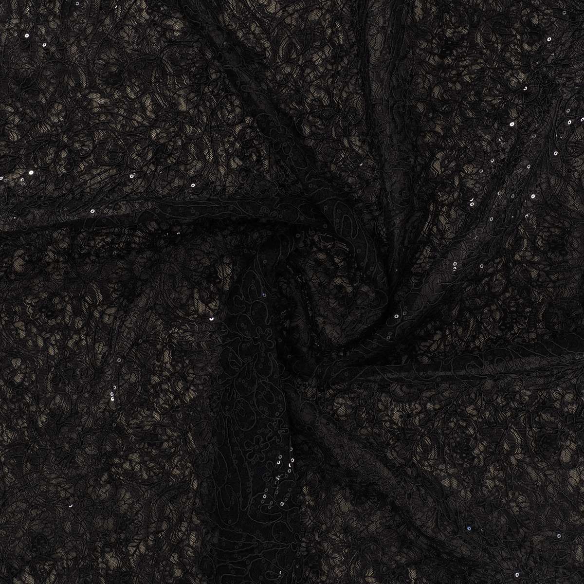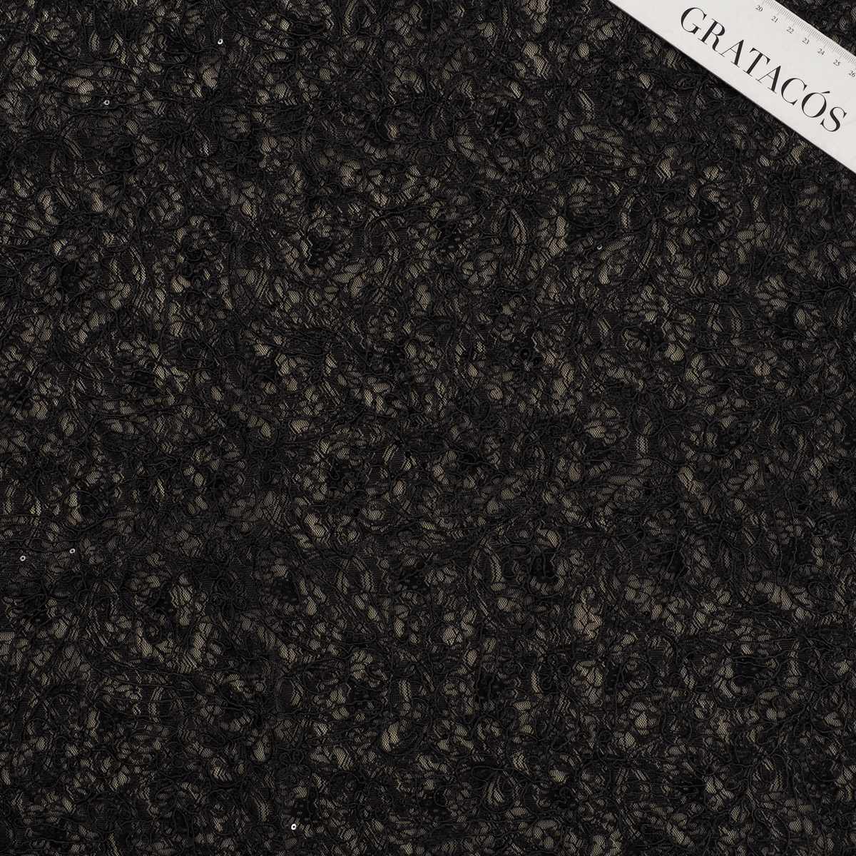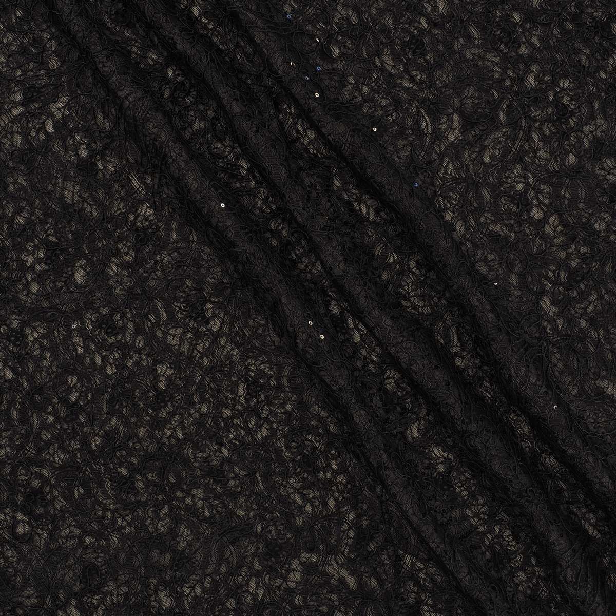 Chantilly lace with thick-thread floral embroidery and transparent sequins that give the base a subtle shimmer.