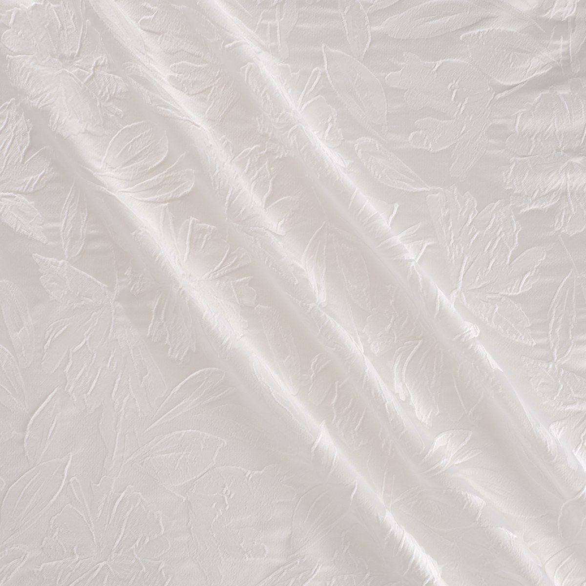 Jacquard cloque con delicado dibujo floral y de hojas en relieve. Mano suave y agradable al tacto. Tejido íntegramente confeccionado con hilo tintado, ideal para creaciones elegantes y con personalidad.